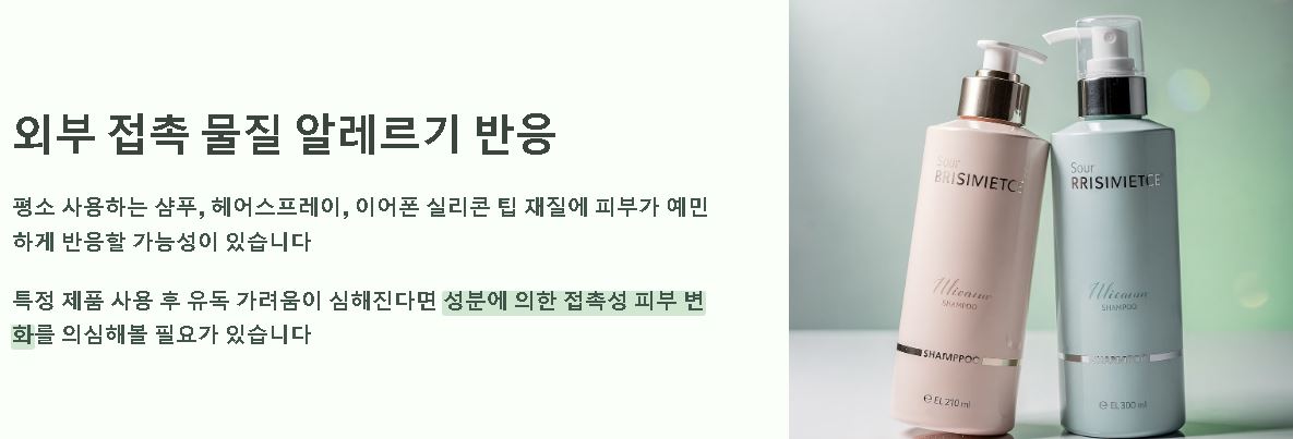 평소 사용하는 샴푸, 헤어스프레이, 혹은 이어폰의 실리콘 팁 재질에 대해 피부가 예민하게 반응할 가능성이 있는 것으로 보입니다. 특정 제품을 사용한 뒤에 유독 가려움이 심해진다면 성분에 의한 접촉성 피부 변화는 아닌지 검토해 볼 가치가 있습니다.