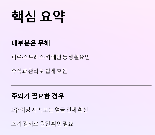 눈밑 떨림 대부분은 피로·스트레스·카페인처럼 생활요인으로 발생하며, 휴식과 관리만으로 쉽게 호전됩니다. 하지만 반복되거나 지속 기간이 길다면 조기에 검사받아 원인을 확인하는 것이 가장 안전합니다.