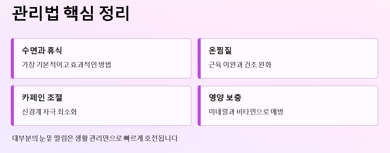 눈 근육 회복에는 수면이 가장 효과적입니다. 1~2일 잘 쉬면 대부분의 떨림은 빠르게 완화됩니다.