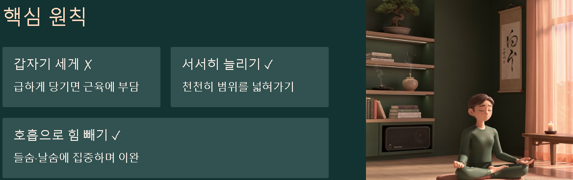 한 번에 해결하려고 세게 당기기보다, 10~20초 단위로 조금씩 늘려가는 방식이 재발과 통증을 줄이는 데 도움이 될 수 있습니다.