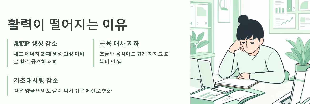 • 세포 에너지 화폐인 ATP 생성 과정이 마비되어 활력이 급격히 떨어집니다.• 근육 대사가 저하되어 조금만 움직여도 쉽게 지치고 회복이 안 됩니다.