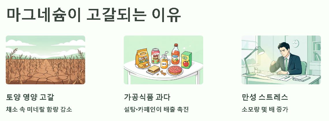 우리는 왜 마그네슘이 부족해질까요? 첫 번째 원인은 토양의 영양 고갈로 채소 속 미네랄 함량이 예전보다 줄었기 때문입니다. 두 번째는 스트레스와 가공식품의 과도한 섭취입니다. 설탕과 카페인, 알코올은 마그네슘의 배출을 촉진하여 체내 수치를 급격히 떨어뜨리는 주범이 됩니다.