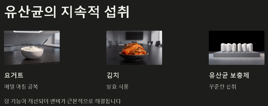 유산균이 장내 유익균을 늘려 배변 리듬을 정상화합니다. 아침 공복 섭취 시 효과가 가장 높습니다.