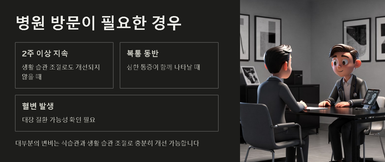 변비는 대부분 식습관과 생활 습관 조절만으로도 충분히 개선이 가능합니다. 하지만 2주 이상 지속되거나 복통·혈변이 동반된다면 대장 질환 가능성을 확인하는 것이 필요합니다.