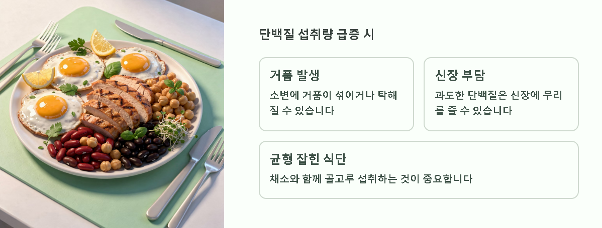 평소보다 단백질 섭취량이 급격히 늘어난 경우 소변에 거품이 섞이거나 탁해질 수 있으므로 균형 잡힌 식단을 유지하는 것이 신장 부담을 줄이는 방법이 될 수 있습니다.