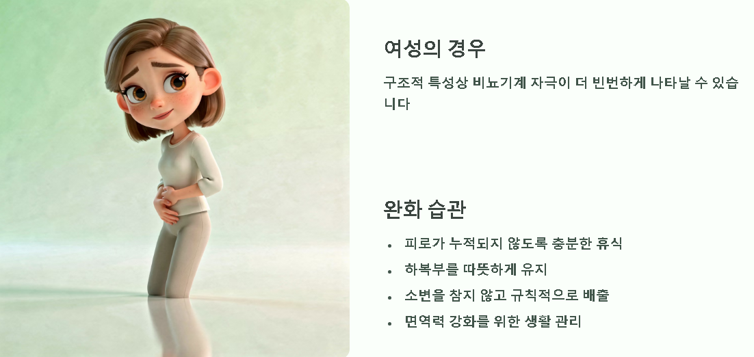 - 소변 시 찌릿한 통증이나 발열, 오한이 동반되는 양상이 관찰될 수 있습니다.