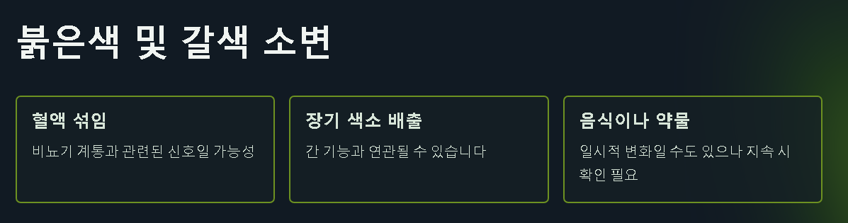 | 붉은색 (혈뇨) | 결석, 염증, 붉은 음식 | 통증 동반 여부 확인 |