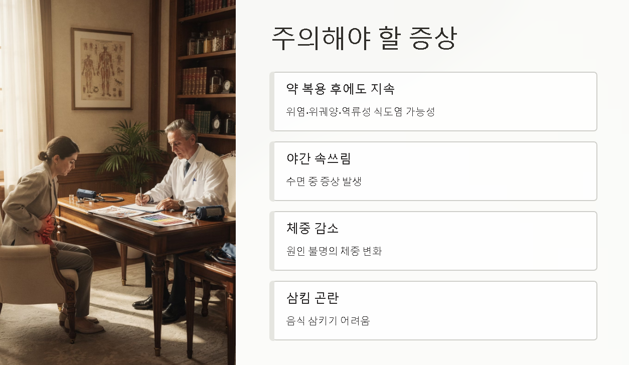 약을 먹어도 속 쓰림이 잦다면 위염·위궤양·역류성 식도염 등 기저 질환 가능성이 있습니다. 특히 야간 속 쓰림, 체중 감소, 음식 삼킴 곤란이 있다면 빠른 진료가 필요합니다. 초기 단계라면 식습관만으로도 충분히 관리 가능하므로 조기 조절이 중요합니다.