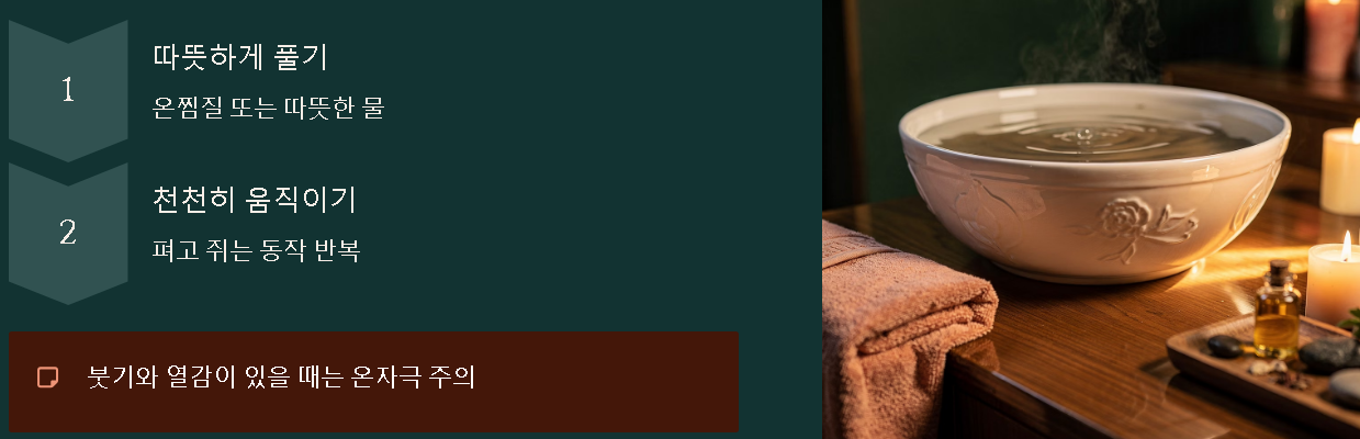 온찜질·가벼운 손 운동은 ‘굳는 느낌’을 줄이는 데 도움이 될 수 있습니다