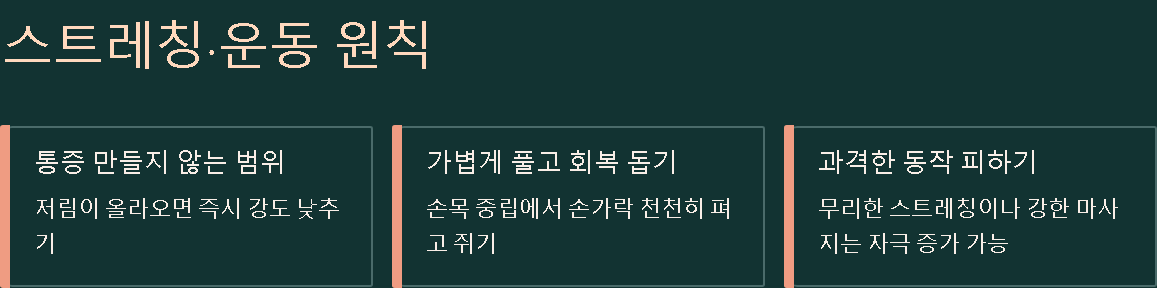 운동 자체로 해결하려 하기보다, 하루 손 사용량을 줄이고 중간중간 쉬는 루틴을 붙이는 것이 재발과 악화를 막는 데 도움이 될 수 있습니다. 예를 들어 업무 중 1~2분만 손을 내려놓고 손가락을 가볍게 펴주는 시간을 넣는 방식이 실용적입니다.