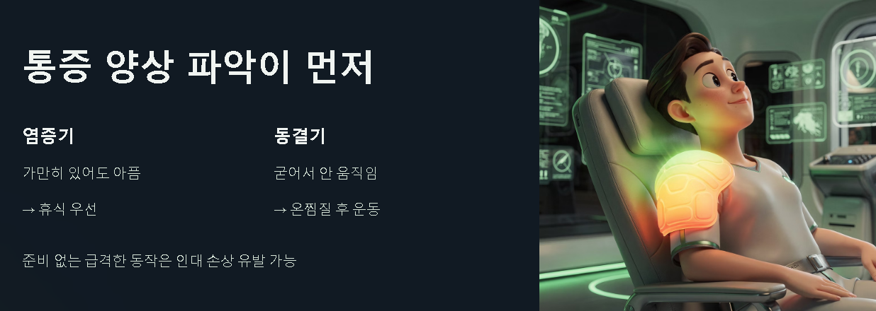 무턱대고 운동을 시작하기보다 현재 통증이 염증기(가만히 있어도 아픔)인지, 동결기(굳어서 안 움직임)인지 파악하는 것이 우선일 수 있습니다. 염증이 심한 시기에는 휴식이 필요할 수 있으며, 만성적인 뻣뻣함이라면 온찜질을 통해 근육을 이완시킨 후 시작하는 것이 부상 방지에 도움이 될 수 있습니다. 준비 운동 없는 급격한 동작은 오히려 인대 손상을 유발할 수 있습니다.