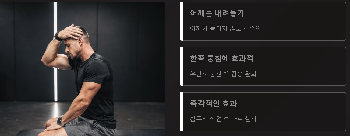 8초가 지나면 천천히 원래 자세로 돌아오고 반대쪽도 같은 방식으로 반복합니다. 이때 어깨가 들리지 않도록 내려놓는 것이 중요합니다. 컴퓨터 작업 후 바로 이 동작을 하면 굳어 있던 부위가 풀리면서 통증이 확 줄어드는 느낌을 받는 경우가 많습니다. 특히 한쪽만 유난히 뭉친 어깨에 효과적입니다.