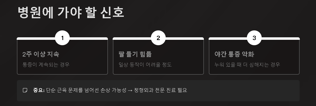 스트레스가 많을수록 어깨는 자연스럽게 위로 들리고 호흡이 얕아집니다. 의식적으로 어깨 힘을 빼고 깊게 숨을 들이마시고 내쉬는 연습을 해보면 근육 긴장이 크게 줄어듭니다. 그럼에도 불구하고 통증이 2주 이상 계속되거나, 팔을 들어 올리기 힘들 정도로 아픈 경우, 밤에 누워 있을 때 통증이 더 심해지는 경우라면 단순 근육 문제를 넘어선 손상 가능성을 의심하고 정형외과 등 전문 진료를 받는 것이 안전합니다.