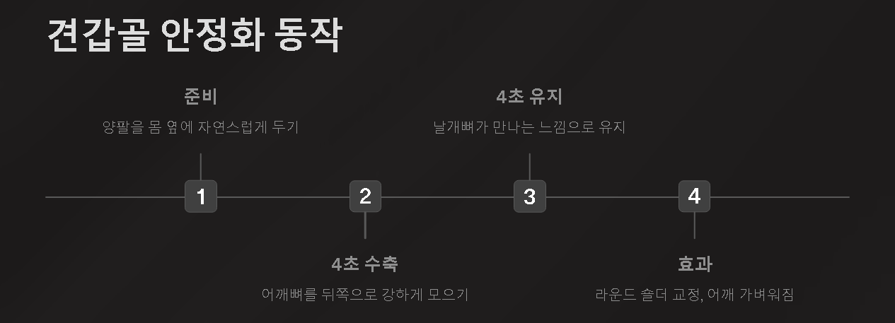 이어서는 양팔을 몸 옆에 자연스럽게 두고, 어깨뼈(날개뼈)를 뒤쪽으로 모으듯이 힘을 줍니다. 마치 등 중앙에서 두 날개뼈가 만난다는 느낌으로 4초간 강하게 수축한 뒤, 나머지 4초 동안 그 상태를 유지합니다. 이 짧은 8초 견갑골 수축만으로도 라운드 숄더가 잠시 펴지면서 통증이 줄어들고 어깨가 한결 가벼워지는 느낌을 받을 수 있습니다.