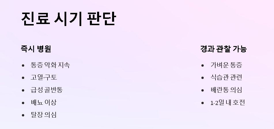 아래 기준에 해당하면 응급 가능성이 있으므로 지체하지 않고 진료가 필요합니다.