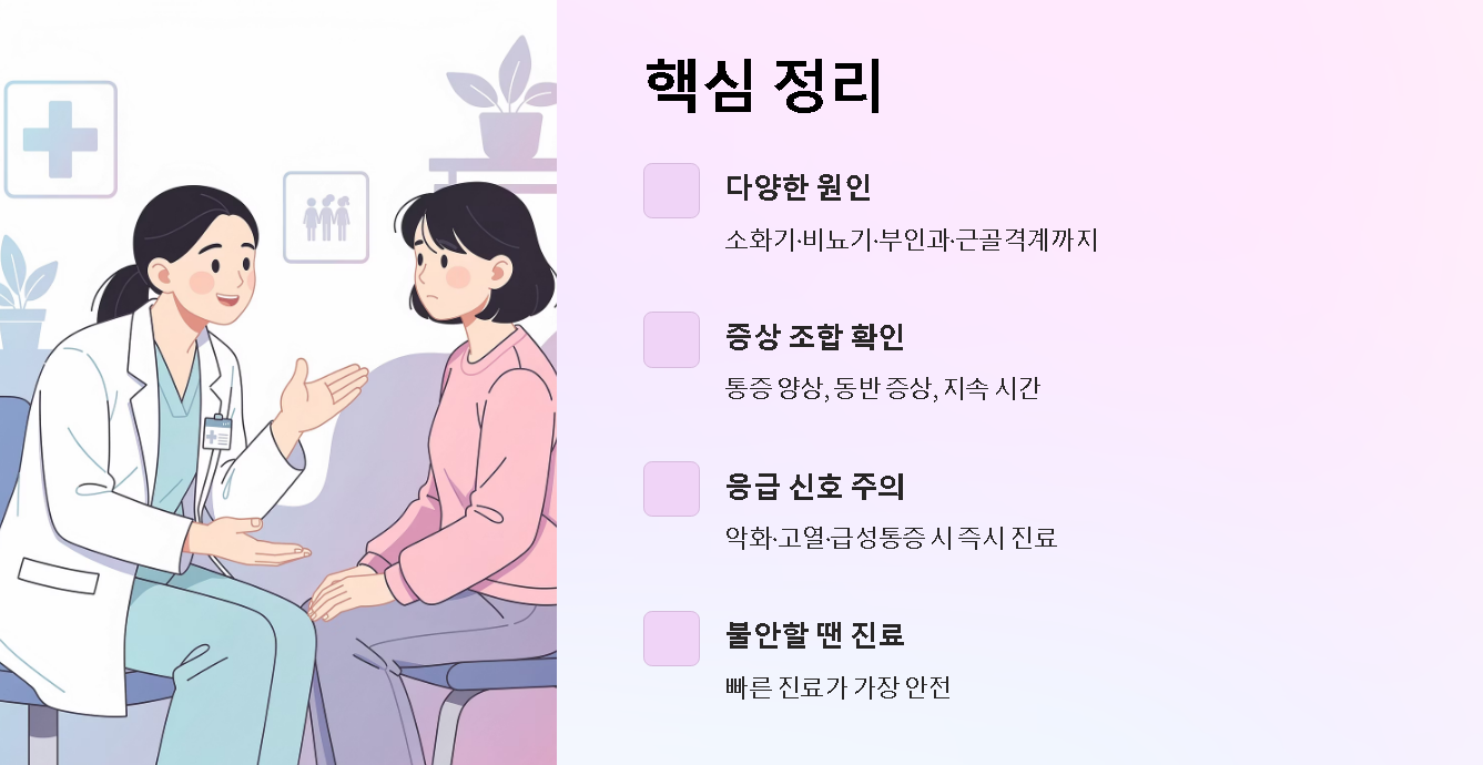 오른쪽 아랫배 통증은 단순한 경우부터 응급까지 원인이 다양하므로, 통증 양상·동반 증상·지속 시간을 함께 살피는 것이 가장 정확한 판단 기준입니다. 불안할 때는 빠르게 진료를 받는 것이 가장 안전합니다.