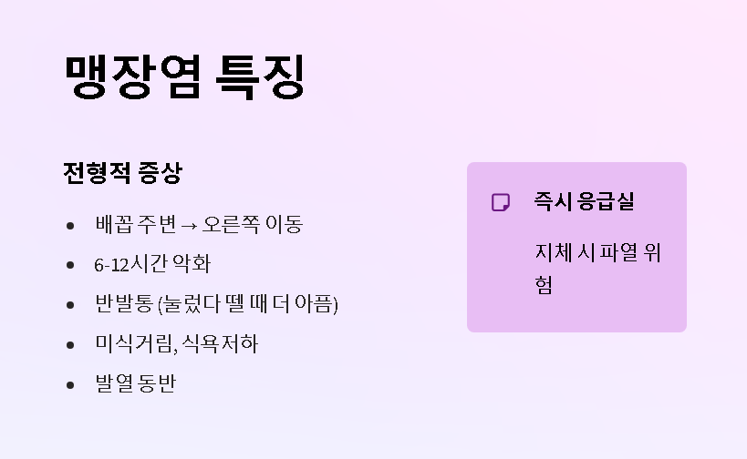 → 맹장염 가능성 높음. 눌렀다 뗄 때 더 아픈 반발통이 특징입니다.