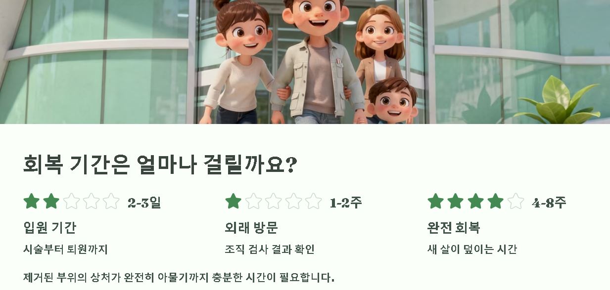 퇴원은 치료의 끝이 아니라 본격적인 자가 회복의 시작입니다. 제거된 부위의 상처가 완전히 새 살로 덮이기까지는 약 4주에서 8주 정도의 시간이 소요되므로 이 기간에는 위벽에 자극을 주는 행동을 삼가야 합니다. 또한 조직 검사의 최종 결과 확인을 위해 약 1~2주 뒤 외래 방문이 필수적입니다.