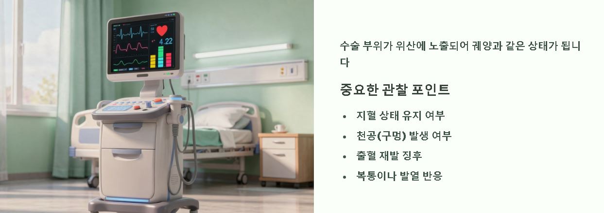 • 시술 후 밤사이 발열, 심한 복통, 토혈 여부를 의료진이 집중적으로 모니터링합니다.