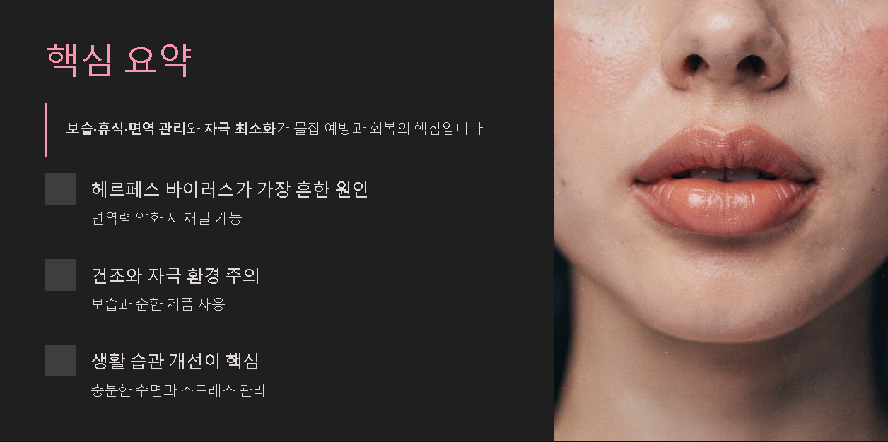 1) 충분한 수면과 휴식으로 면역력 유지 2) 입술 보습 – 세라마이드·시어버터 성분 립밤 사용 3) 수분 섭취 늘려 입술 건조 방지 4) 물집이 생기면 터뜨리지 말고 자연 회복 유도 5) 헤르페스 의심 시 항바이러스 연고를 초기 증상 단계에서 사용 6) 스트레스가 많은 시기에는 립 제품 자극을 줄이는 것이 좋습니다.
