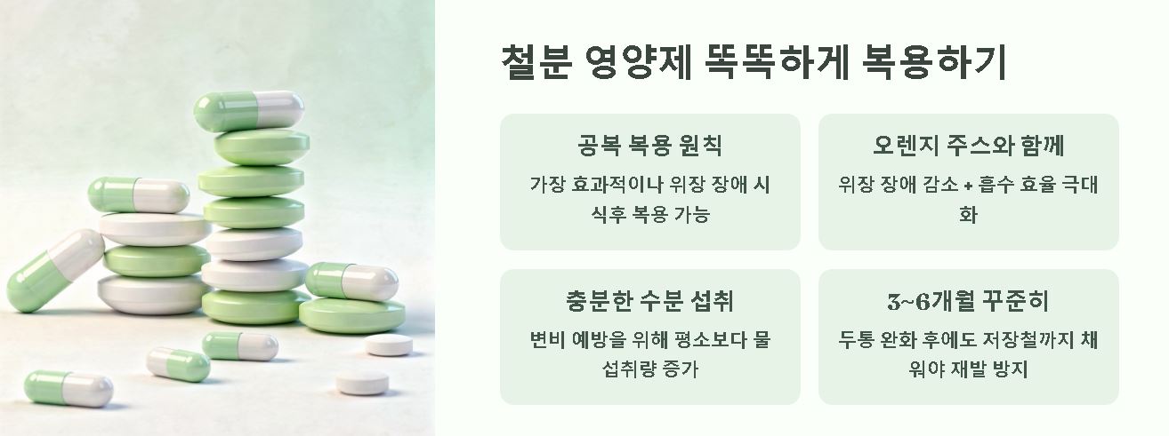 식단만으로 두통이 호전되지 않는다면 전문의 상담 후 철분 영양제를 복용해야 합니다. 철분제는 공복에 복용하는 것이 가장 효과적이지만, 위장 장애가 심하다면 식후에 복용하기도 합니다. 두통이 사라졌더라도 체내 저장철(페리틴)까지 채우기 위해서는 일정 기간 꾸준한 복용이 필요합니다.