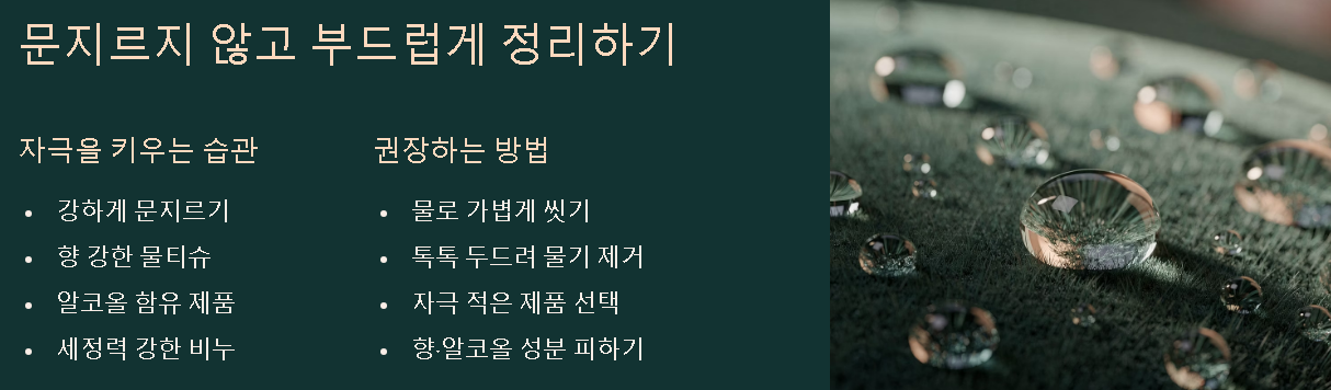 가려움·따가움이 있는 날일수록 “더 깨끗이”보다 “덜 자극적으로”가 장기적으로 편해지는 경우가 많습니다.