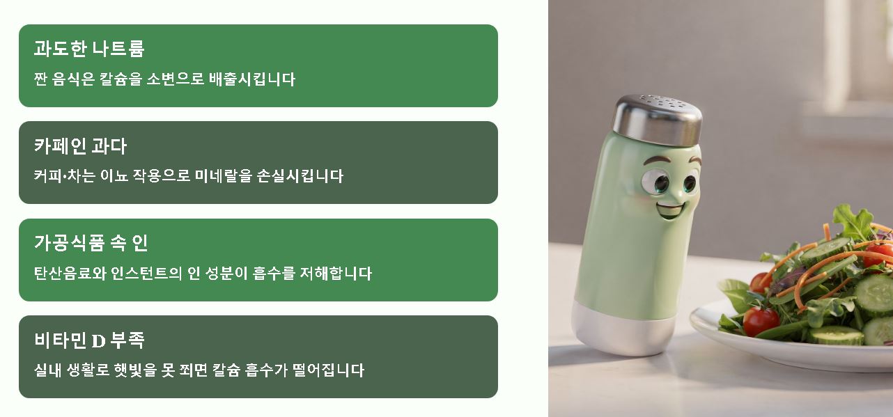영양제 복용만큼 중요한 것이 칼슘 마그네슘 영양제 효능을 뒷받침할 생활 습관입니다. 과도한 나트륨 섭취는 칼슘을 소변으로 배출시키기 때문에 싱겁게 먹는 습관이 필요하며, 주기적인 햇빛 쬐기를 통해 천연 비타민 D를 합성하는 노력이 병행되어야만 비싼 영양제의 효과를 제대로 볼 수 있습니다.