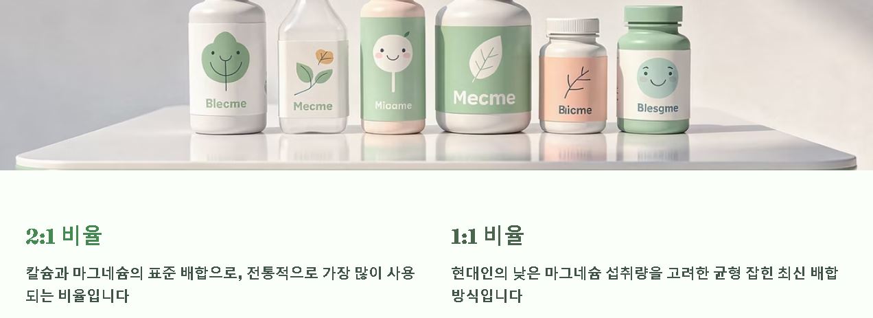 영양제를 고를 때는 성분의 배합 비율을 유심히 봐야 합니다. 일반적으로 칼슘과 마그네슘의 2:1 비율이 표준으로 알려져 있지만, 최근에는 현대인의 낮은 마그네슘 섭취량을 고려해 1:1 비율로 구성된 제품도 큰 인기를 얻고 있습니다. 본인의 식단에서 어떤 영양소가 더 부족한지 파악하는 것이 우선입니다.