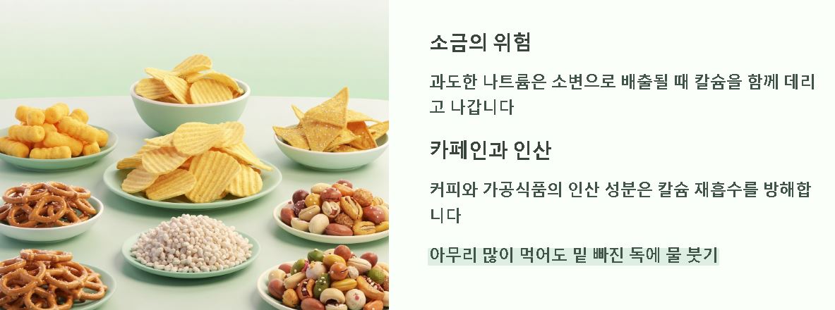 - ✅ 방해 요인 파악: 카페인이나 나트륨 섭취가 칼슘 배출을 돕고 있지는 않은지 확인