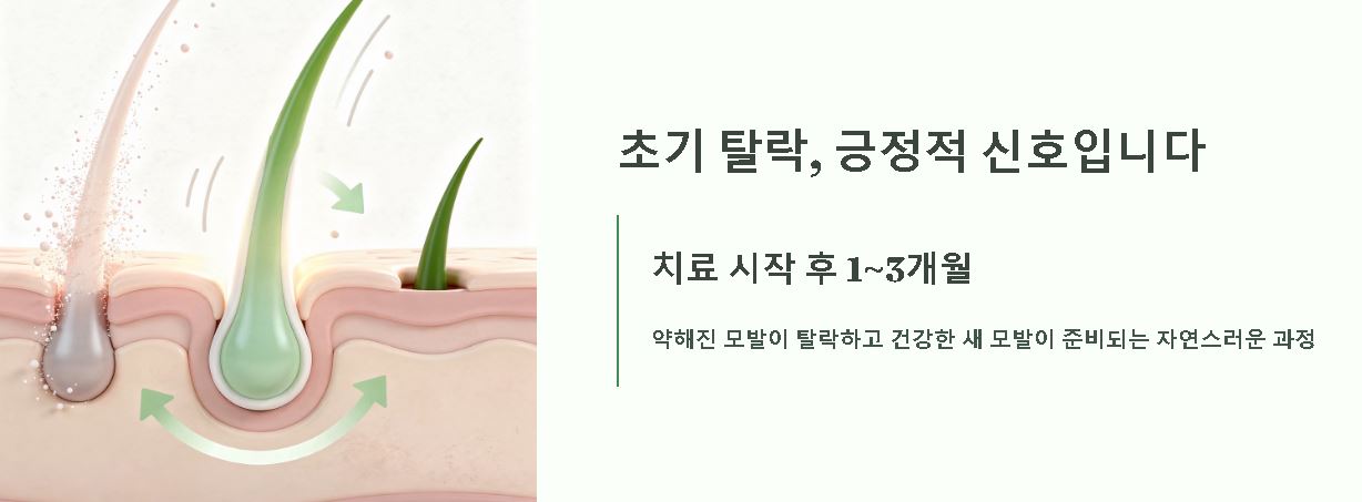 치료를 시작한 지 약 1~3개월 사이에 모발이 평소보다 더 많이 빠지는 경험을 할 수 있는데, 이는 자연스러운 과정으로 분석됩니다. 약해진 모발이 탈락하고 그 자리에 굵고 건강한 새 모발이 올라오기 위한 준비 단계인 경우가 많으므로 지나친 염려는 오히려 치료 흐름에 방해가 될 수 있는 것으로 보입니다. 이 시기를 차분하게 넘기는 것이 장기적인 모발 관리의 성패를 좌우하는 배경이 되기도 합니다.