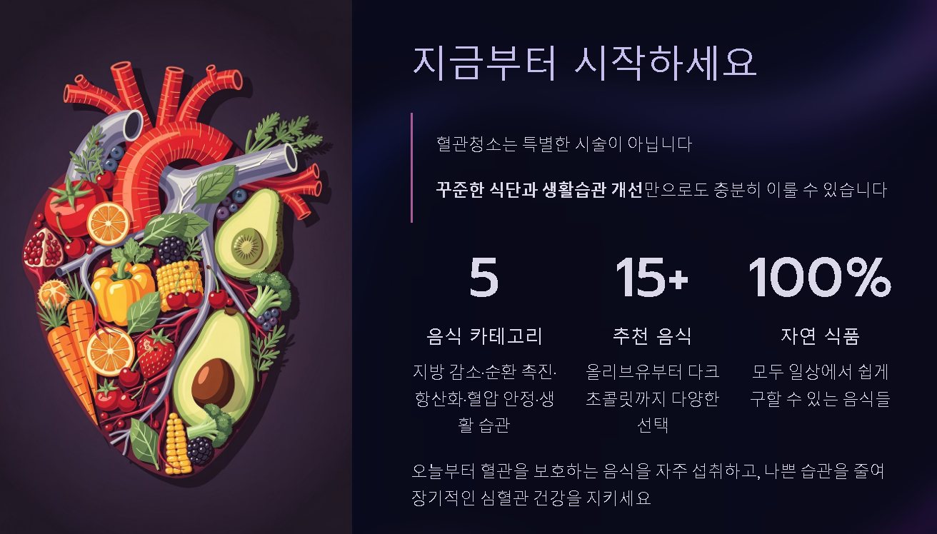 혈관청소는 특별한 시술이 아니라, 꾸준한 식단과 생활습관 개선만으로도 충분히 이룰 수 있습니다. 지금부터라도 혈관을 보호하는 음식을 자주 섭취하고, 나쁜 습관을 줄이면 장기적인 심혈관 건강을 지킬 수 있습니다.